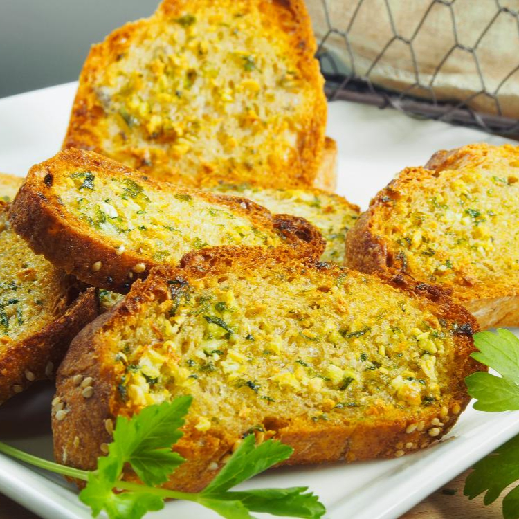 Crujiente rebana de pan toscano o centeno, bañados con aceite de olivo, Ajo fresco picado, Hierbas y Parmesano