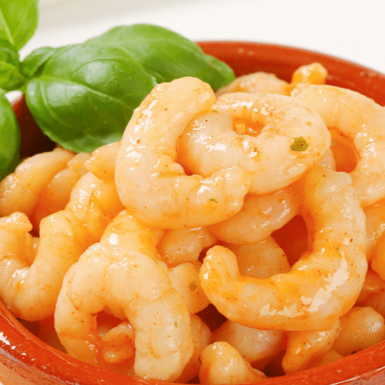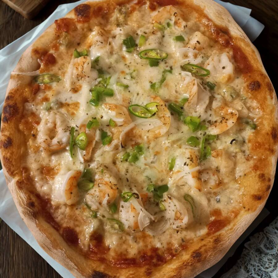 Salsa de jitomate casera, Queso, Camarón, Orégano, Pimiento verde, Cebolla, Chile serrano, Aceite de oliva