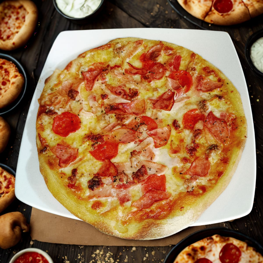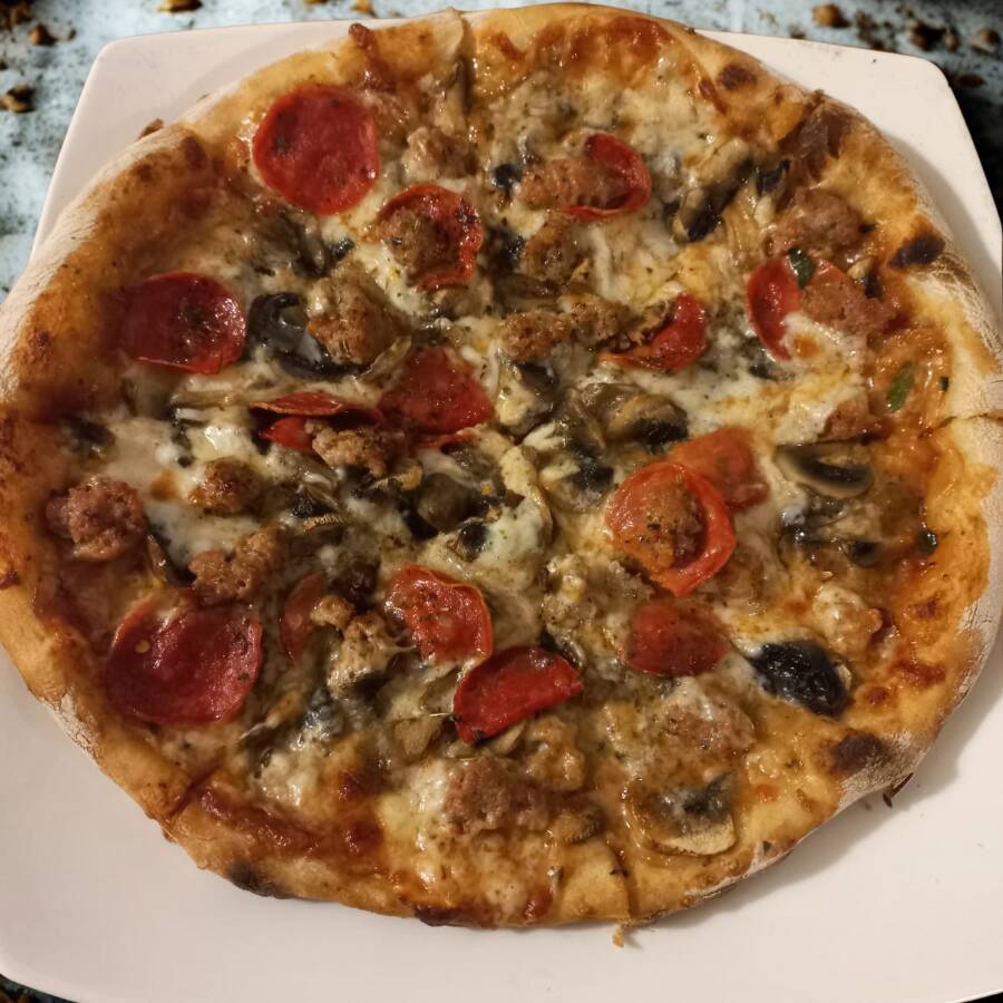 Salsa de jitomate casera, Orégano, Queso, Champiñón, Salchicha Italiana, Pepperoni, Aceite de olivo.