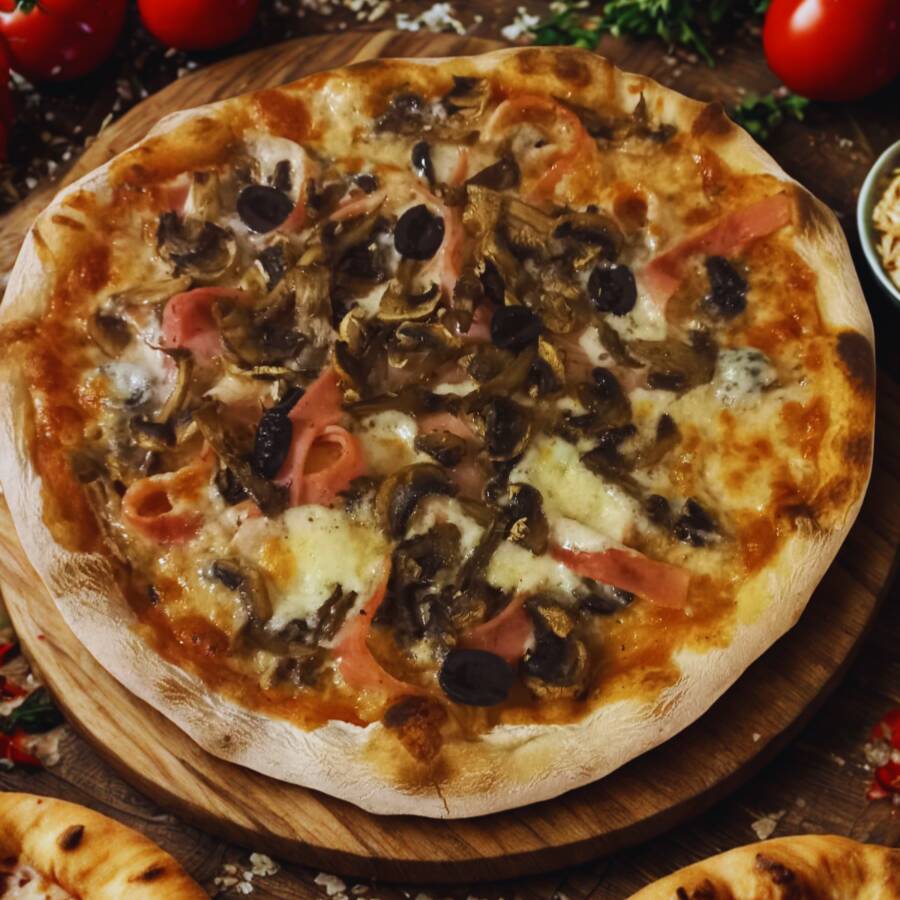 Salsa de jitomate casera, Queso, Orégano, Jamón, Champiñón, Aceituna negra, Aceita de oliva