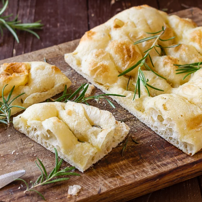 Crujiente y esponjosa pan pizza, Bañados con aceite de olivo, Romero, Sal del mar pacífico y Parmesano