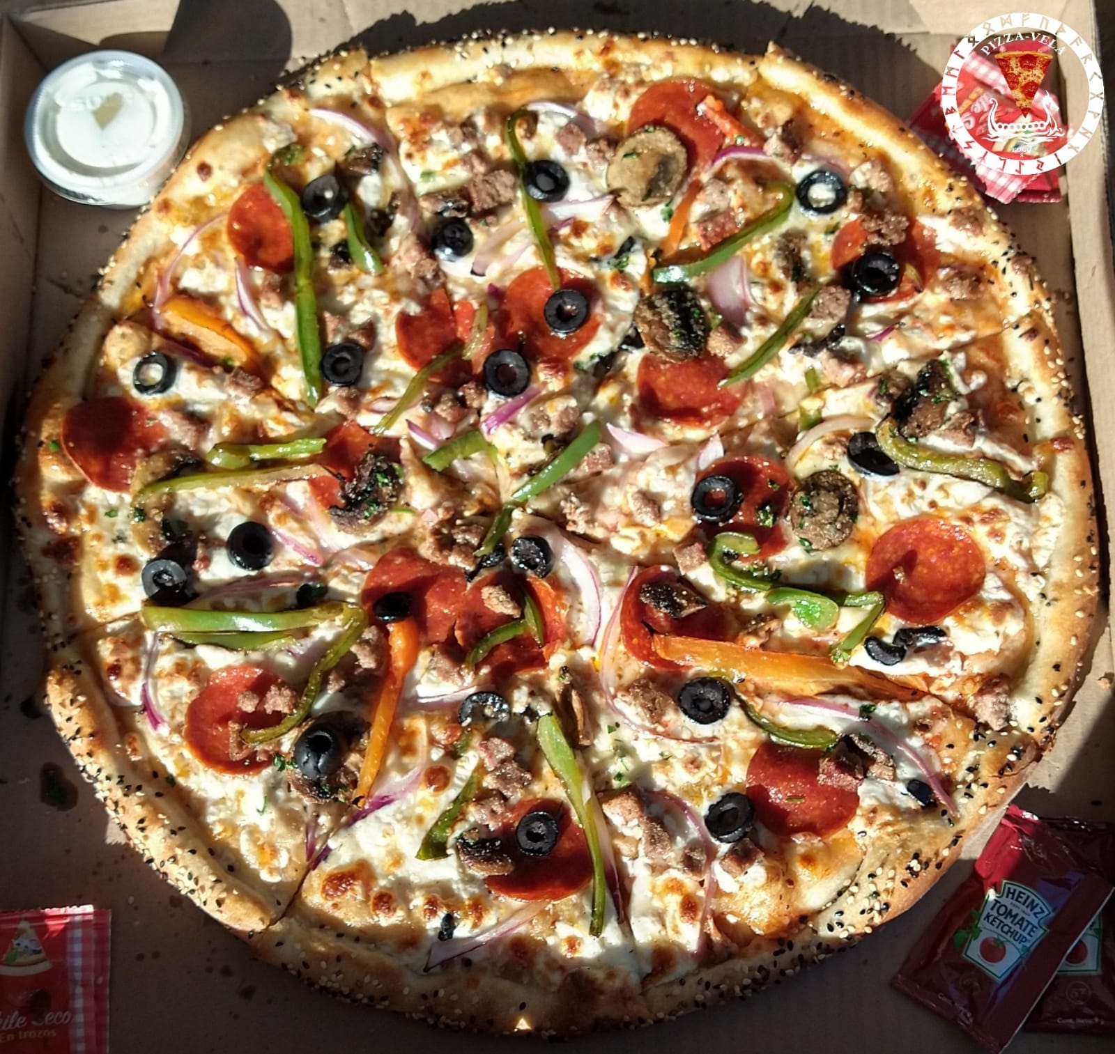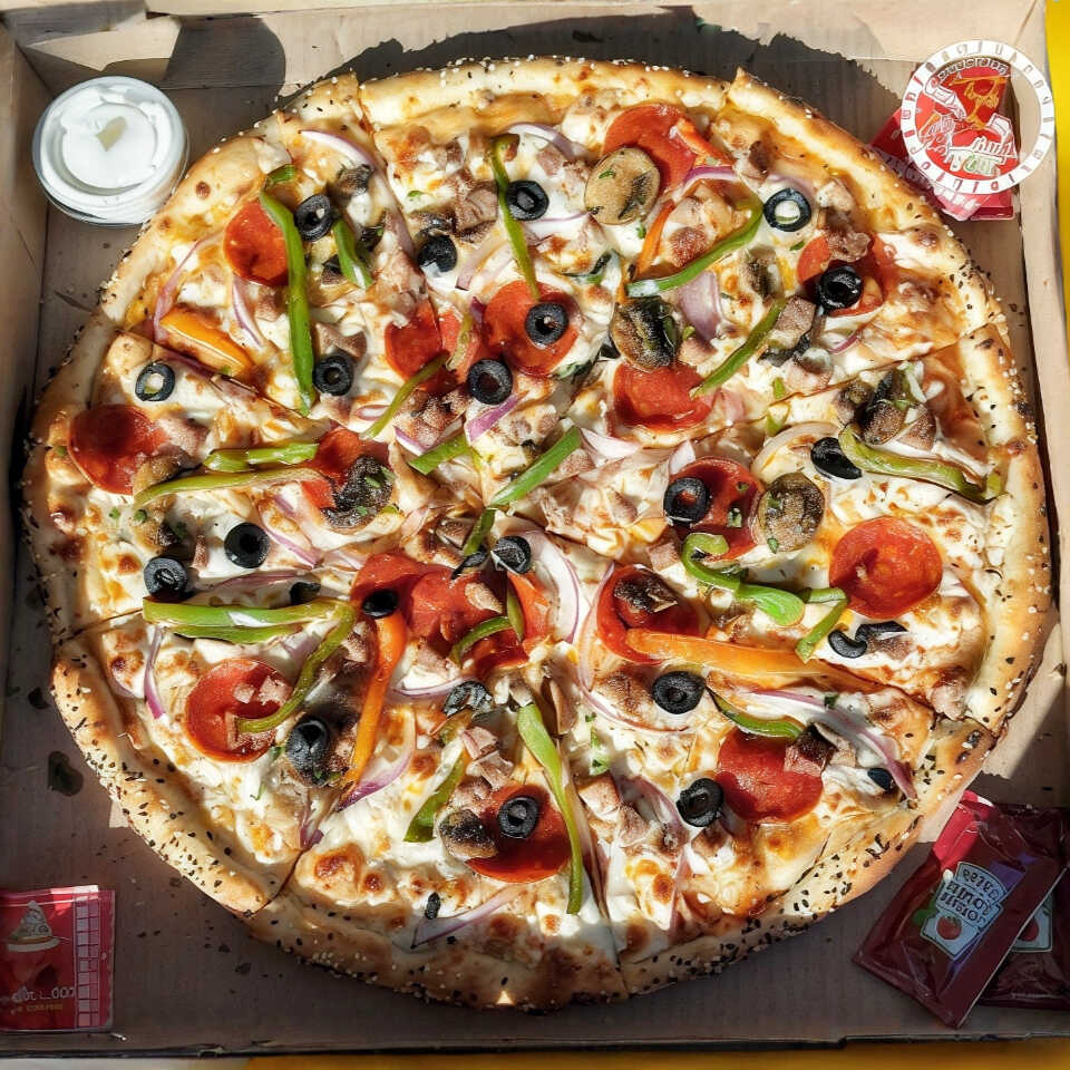 Pizza suprema con salchicha italiana, pepperoni, pimientos, champiñón, cebolla y aceituna negra, tamaño familiar de 16 pulgadas (40 cm) elaborada con productos frescos, masa fina y delgada estilo New York.