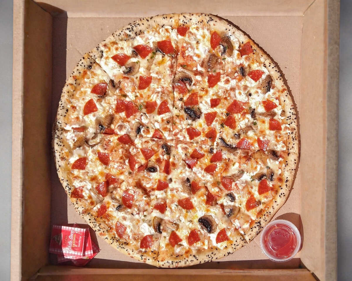 Pizza con champiñón y pepperoni, tamaño chica de 12 pulgadas (30 cm) elaborada con productos frescos, masa fina y delgada estilo New York.