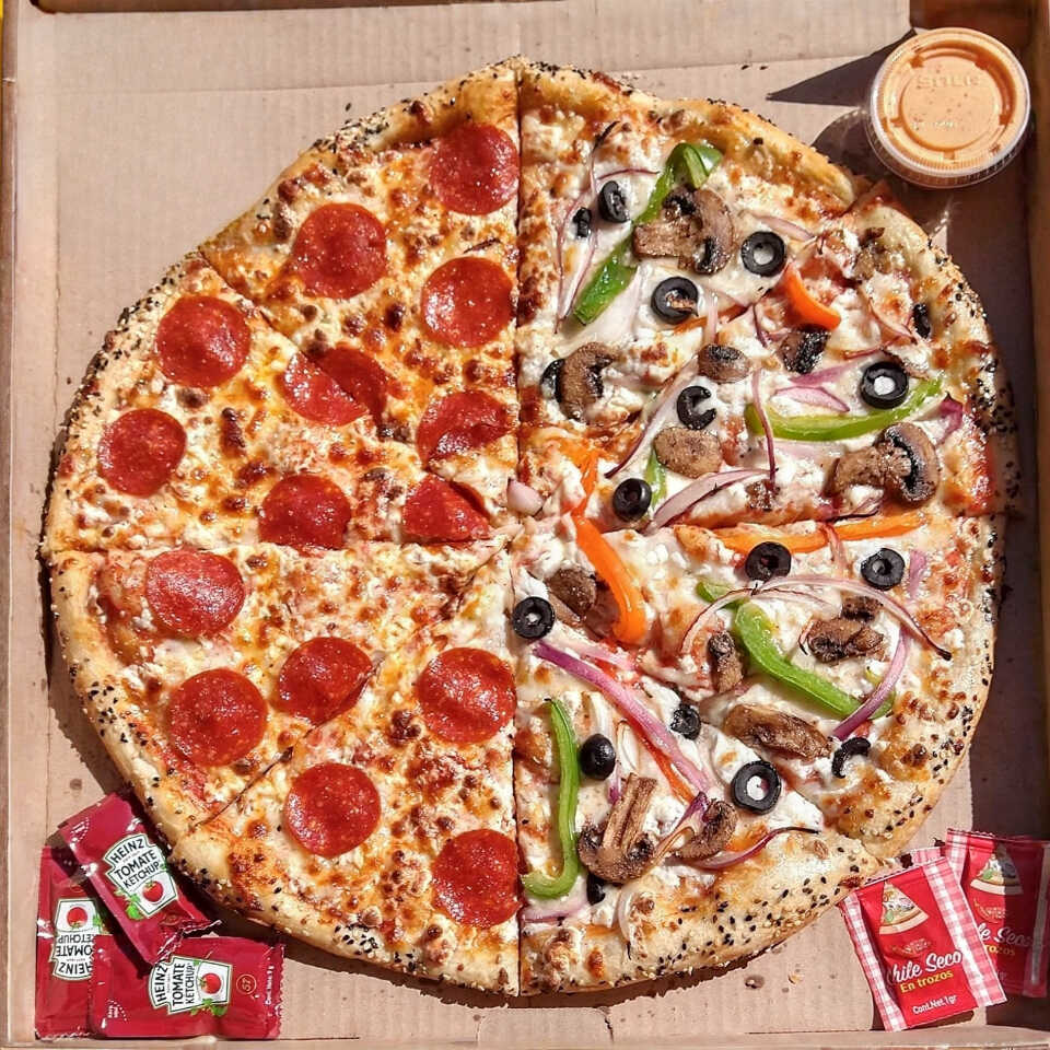 2 mitades de pizza a elegir, tamaño chica de 12 pulgadas (30 cm) elaborada con productos frescos, masa fina y delgada estilo New York.
