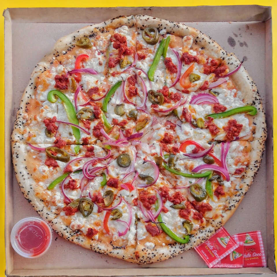 Pizza mexicana con chorizo, chile jalapeño, pimientos, cebolla morada, tamaño chica de 12 pulgadas (30 cm) elaborada con productos frescos, masa fina y delgada estilo New York.