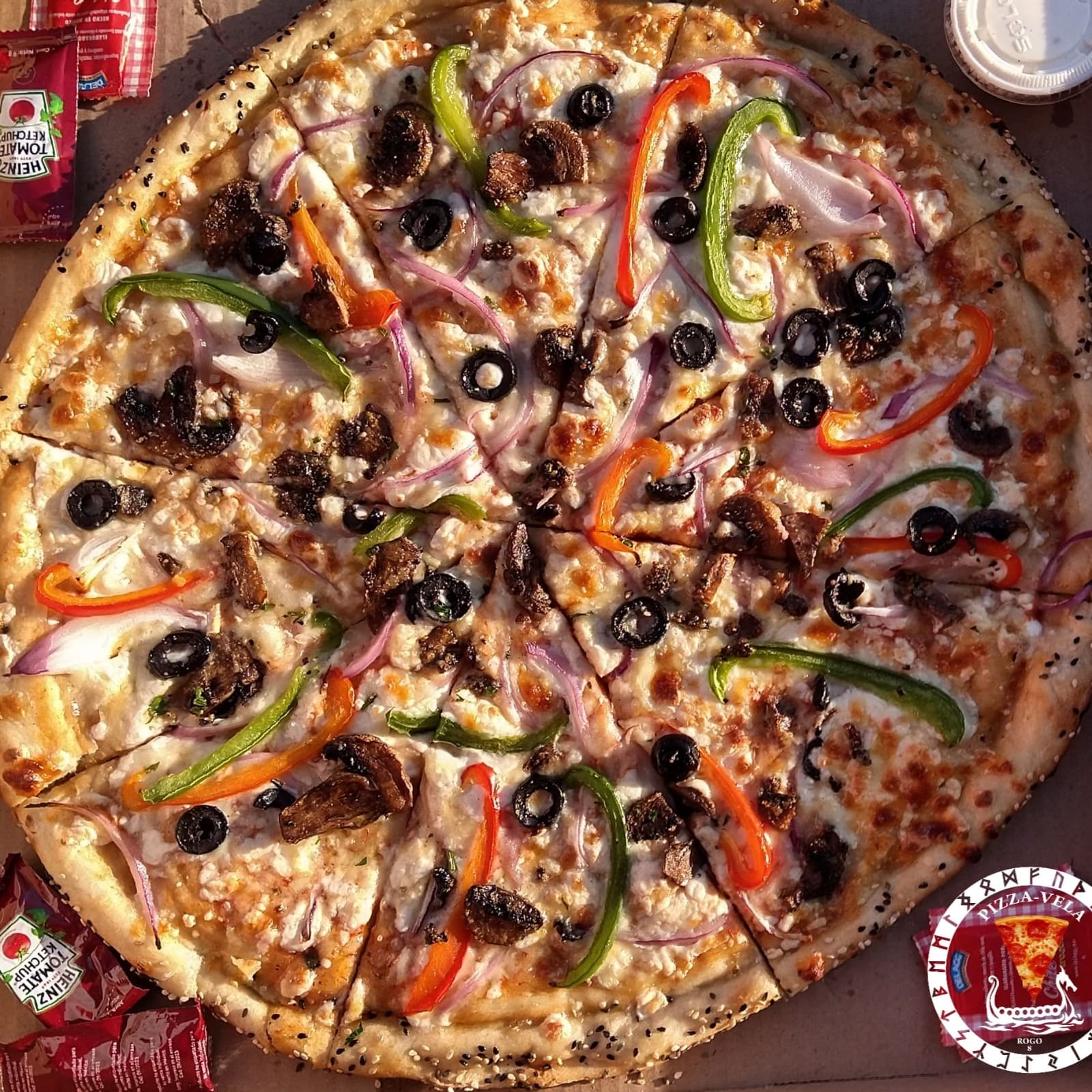 Pizza vegetariana con pimientos, champiñón, cebolla y aceituna negra, tamaño chica de 12 pulgadas (30 cm) elaborada con productos frescos, masa fina y delgada estilo New York.