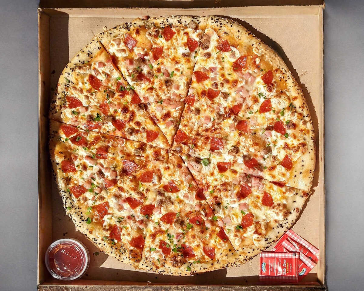 Pizza carnívora con pepperoni, salchicha italiana, jamón y tocino, tamaño chica de 12 pulgadas (30 cm) elaborada con productos frescos, masa fina y delgada estilo New York.