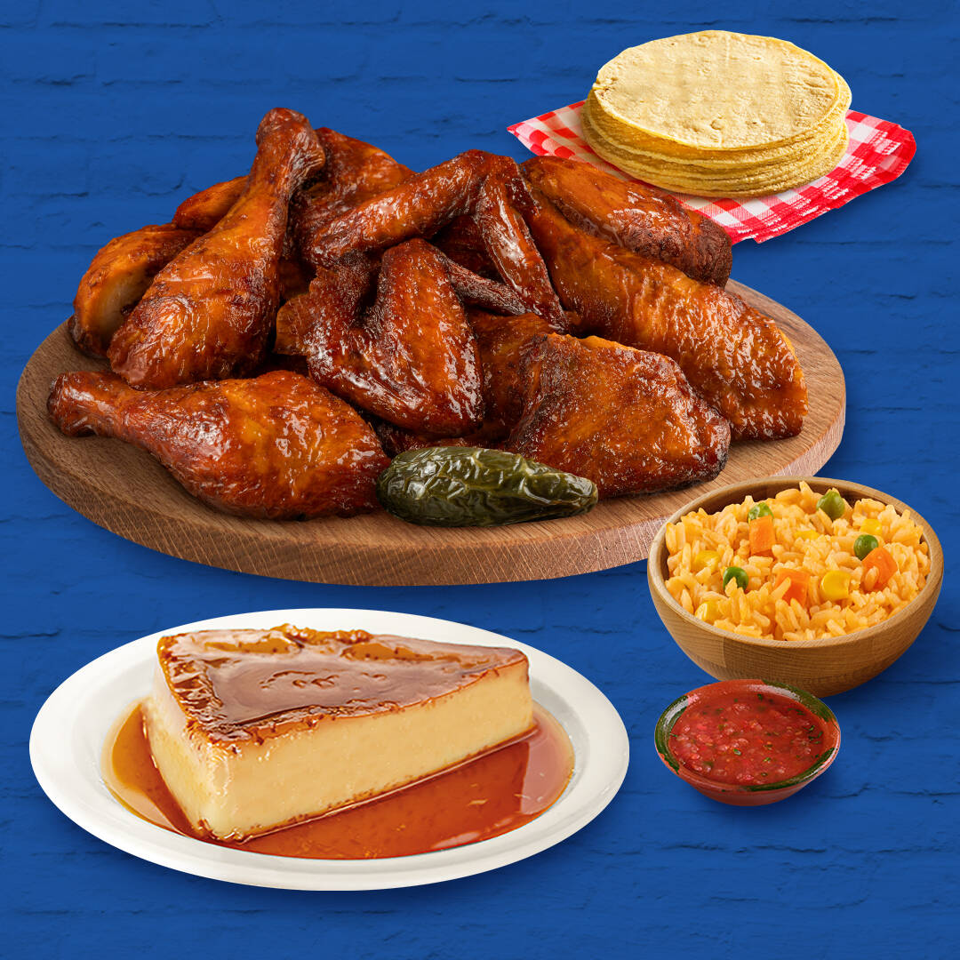 Un pollo al estilo carnitas, con un acompañamiento a elegir y de REGALO UN FLAN NAPOLITANO. Incluye salsa, tortillas y chile toreado