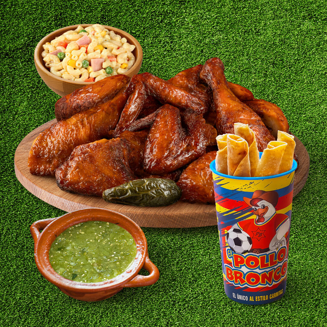 1 pollo, 1 acompañamiento, 5 tacos dorados, salsa verde y un BRONCOVASO FUTBOLERO