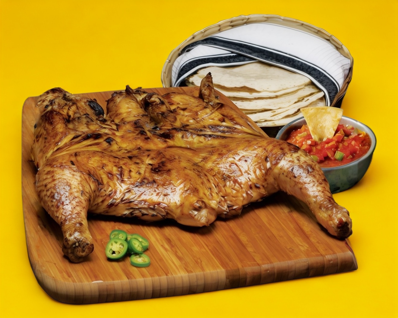 Medio pollo asado al carbón con salsa de jitomate, tortillas hechas a mano, 1 chile asado y totopos.