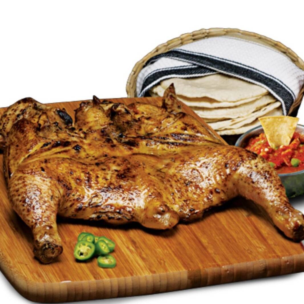 8 piezas de pollo asado al carbon con salsa de jitomate, tortillas hechas a mano, 1 chile asado y totopos