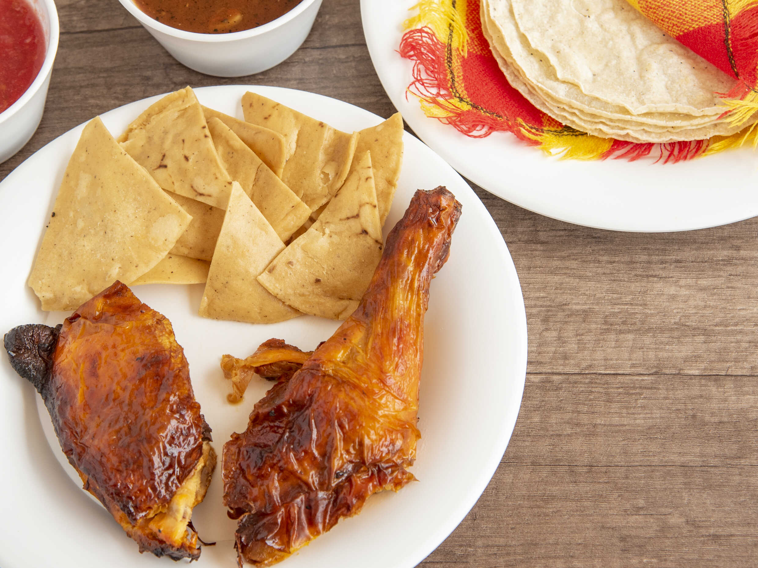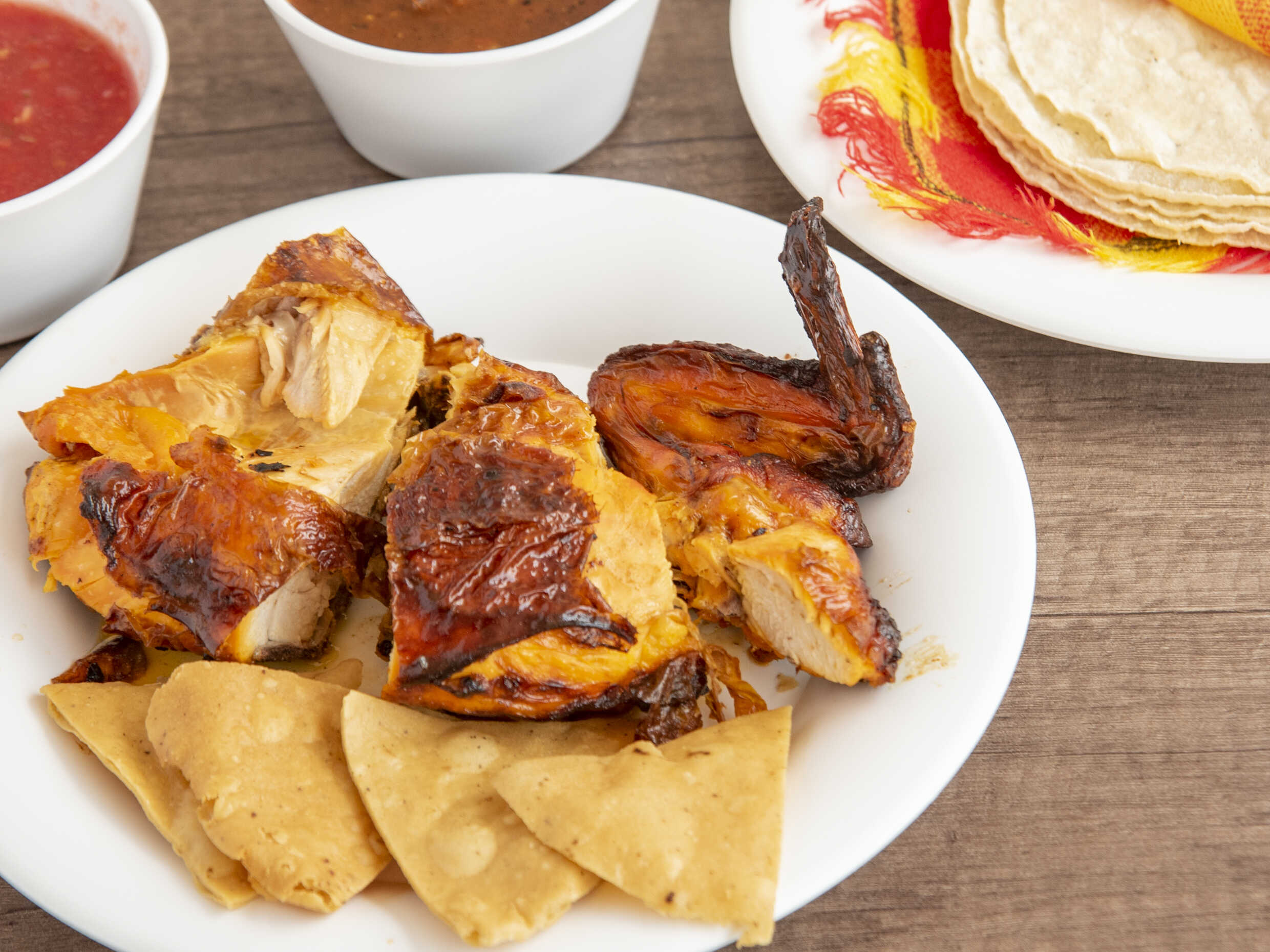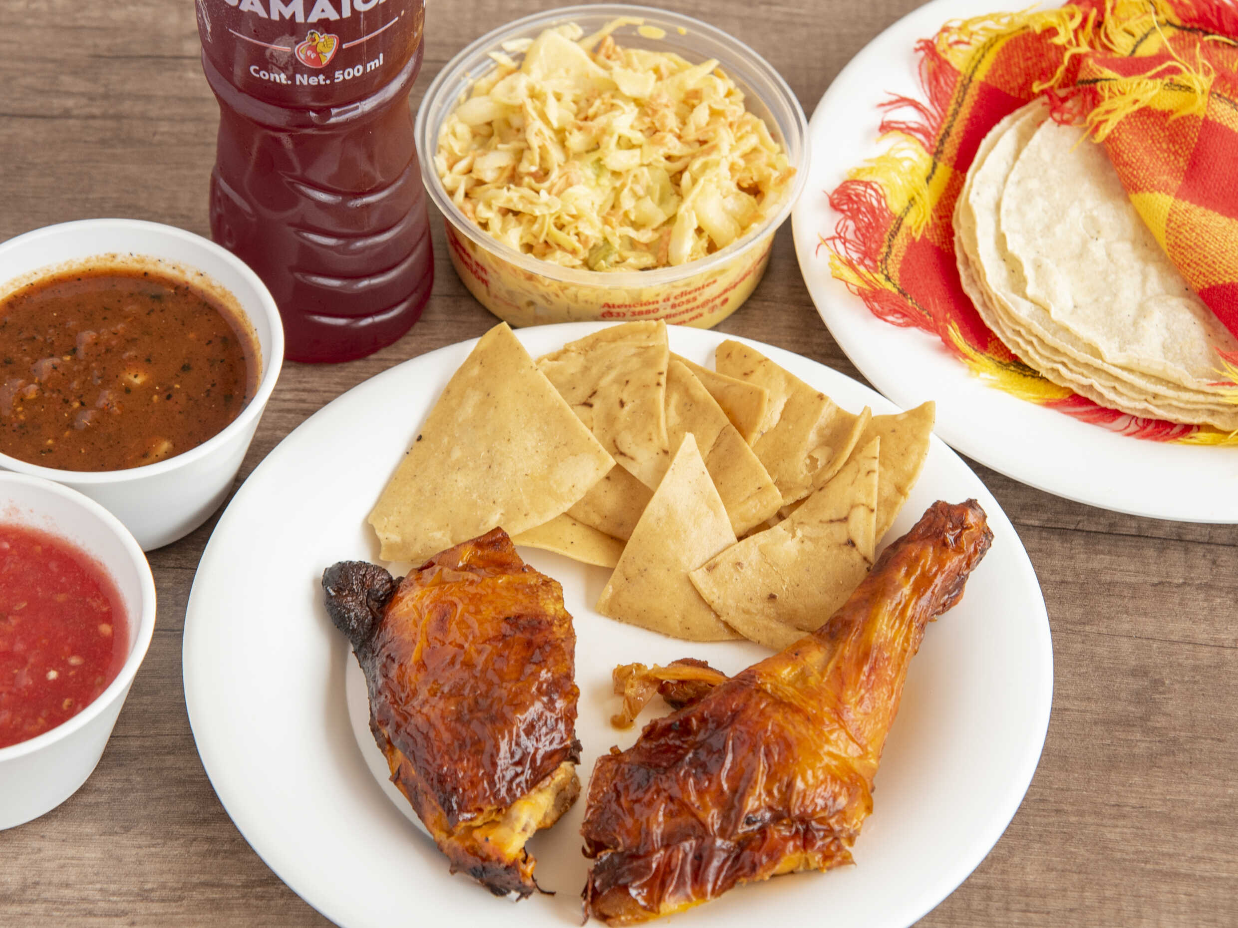 5 piezas (medio pollo) bañado con una salsita especial hecha con Tajín, incluye salsa y tortillas.