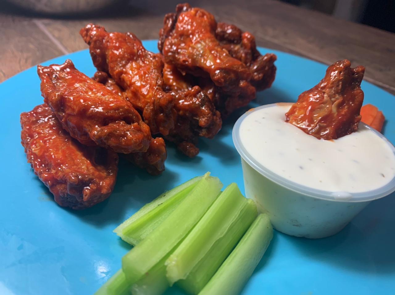 Orden de 50 alitas acompañadas de aderezo ranch, zanahoria y apio.