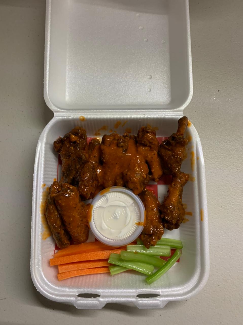 Orden de 10 alitas acompañadas de aderezo ranch, zanahoria y apio.
