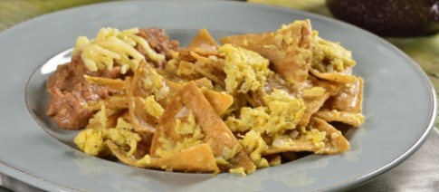 Huevos revueltos con tortillas doraditas, cebolla, chorizo. Acompañadas de frijoles y aguacate.
