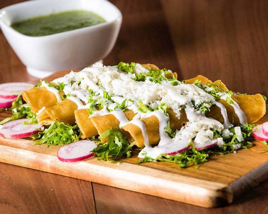 5 tacos dorados de pollo bañados con salsa verde, crema y queso. 5 pieces of chicken tacos with lettuce, onions, green sauce, cream and cheese!