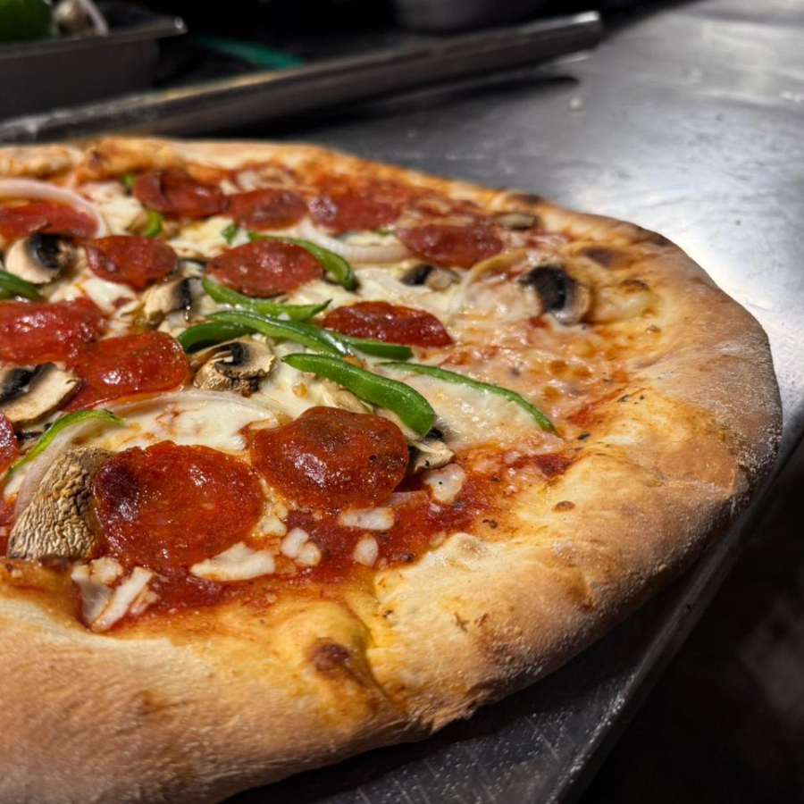Salsa de tomate, queso mozarella, cebolla, champiñones, pimiento morron, aceitunas negras, peperoni.