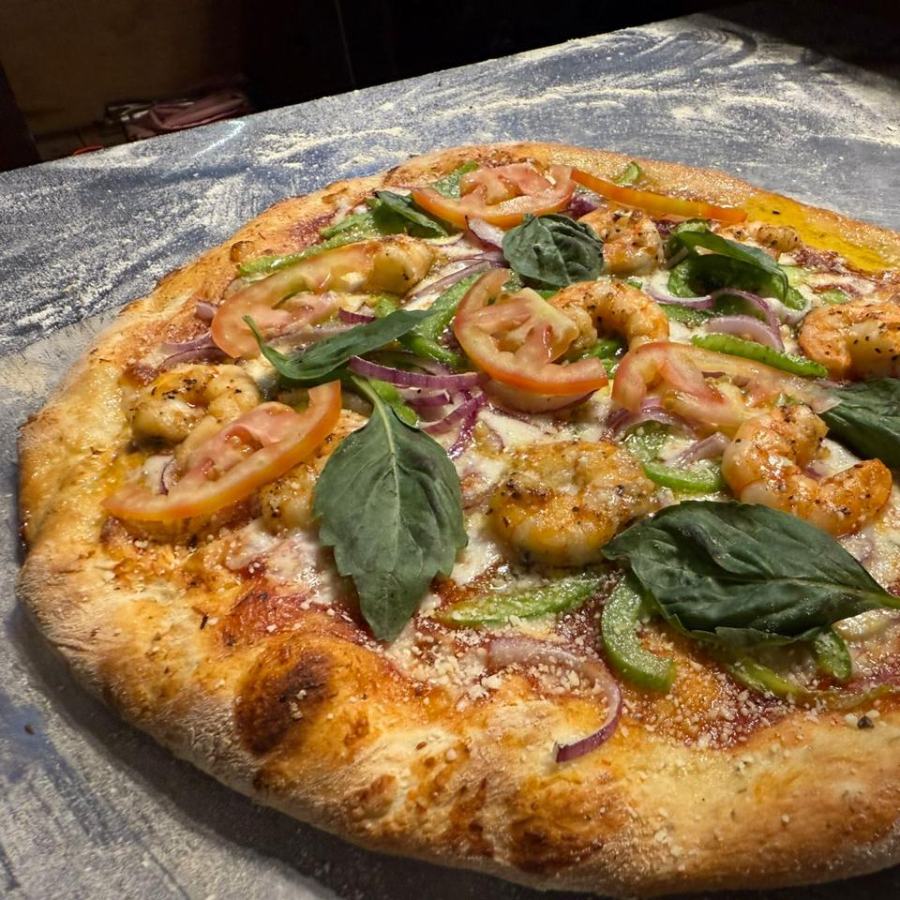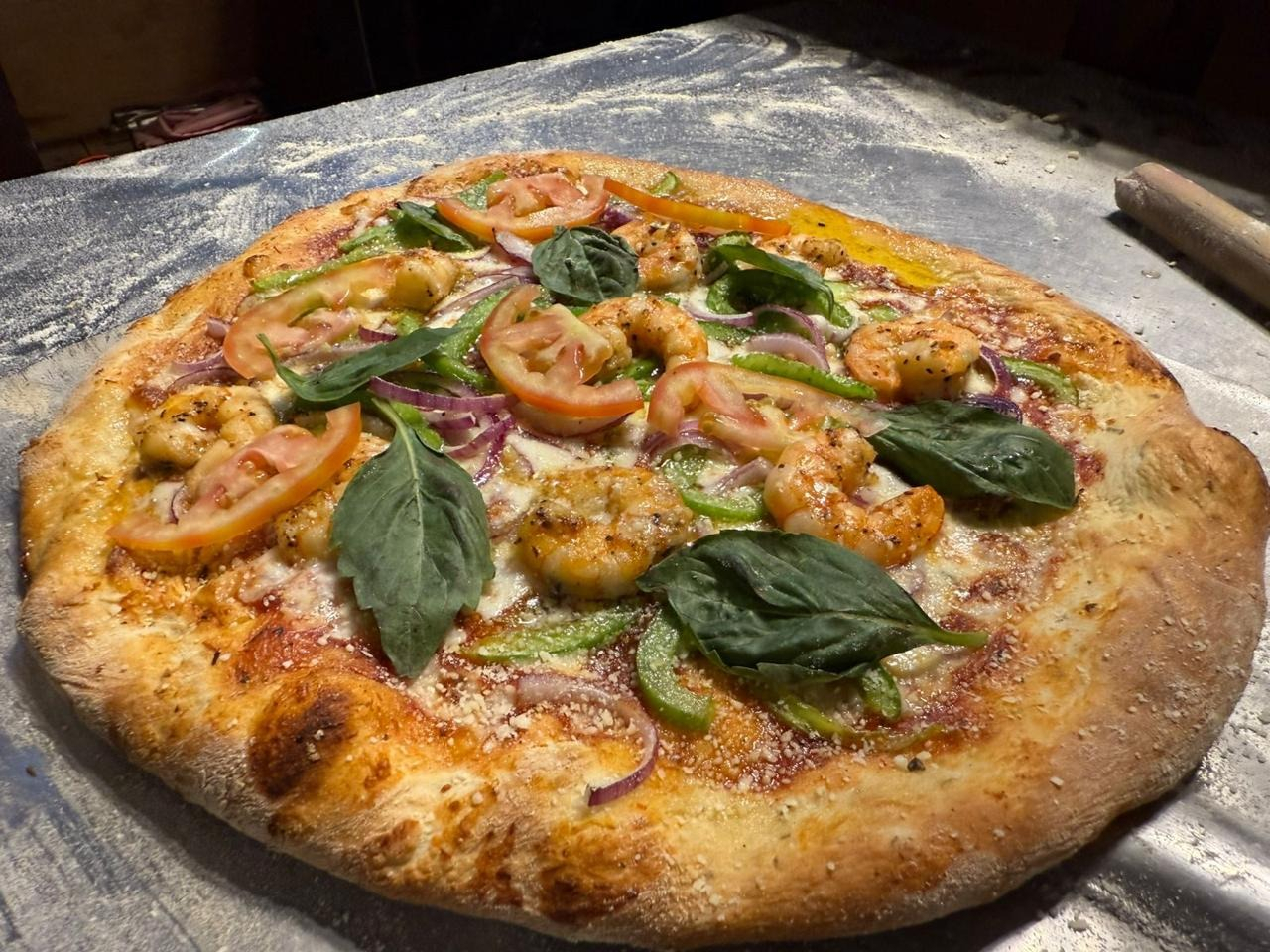 Salsa de tomate , queso mozarella, camarones,Marlin ahumado , cebolla, pimiento morron .