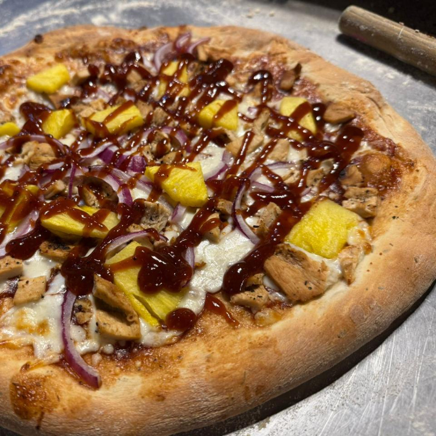 Salsa bbq, queso mozarella, trozos de pollo, Cebolla, piña, chile jalapeño.
