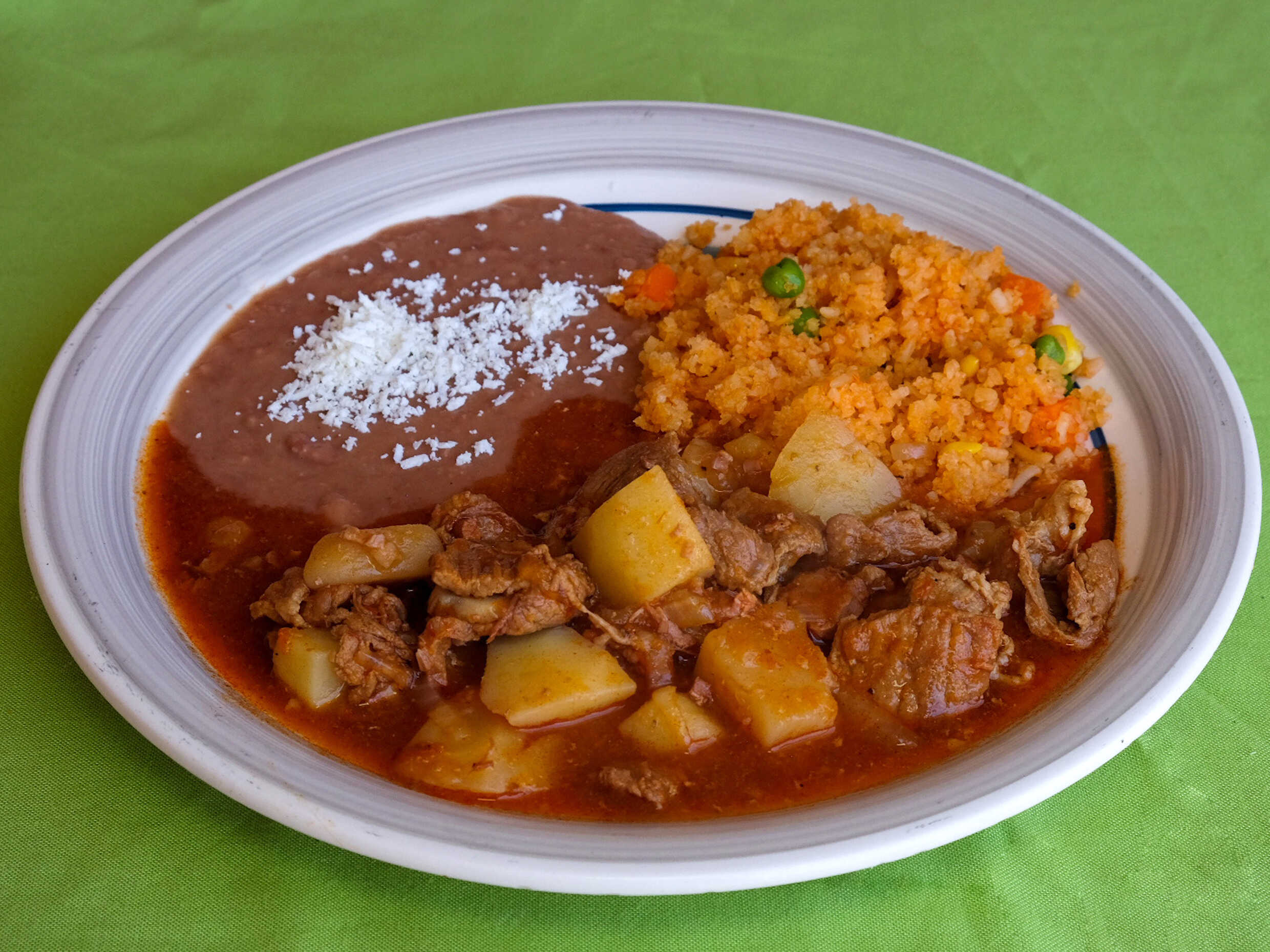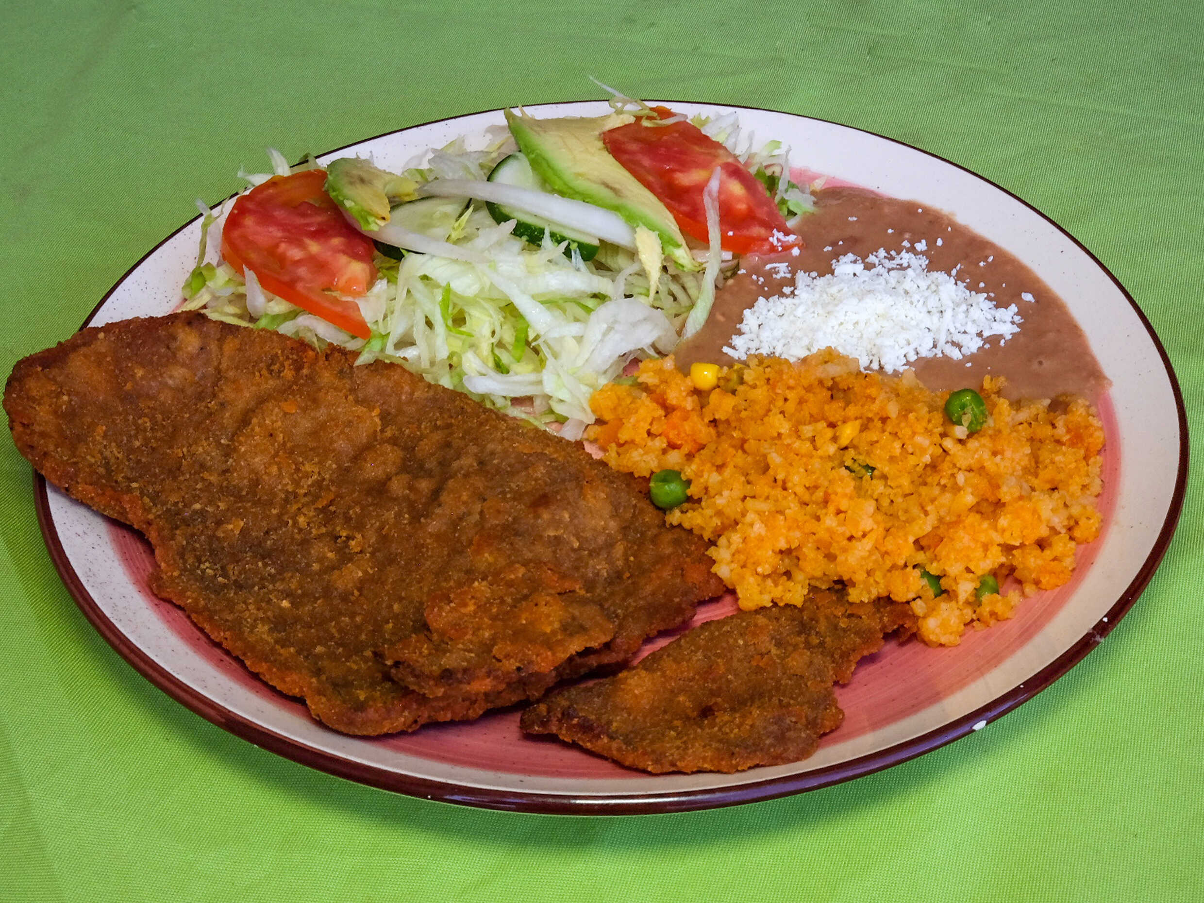 Acompañado de sopa del día, arroz, frijoles, tortillas y salsa.