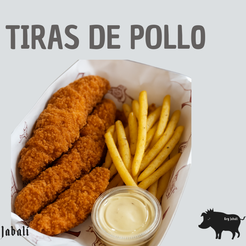 4 Tiras de pollo frito, papas, elote, opcional bañadas en salsa bbq o bufalo