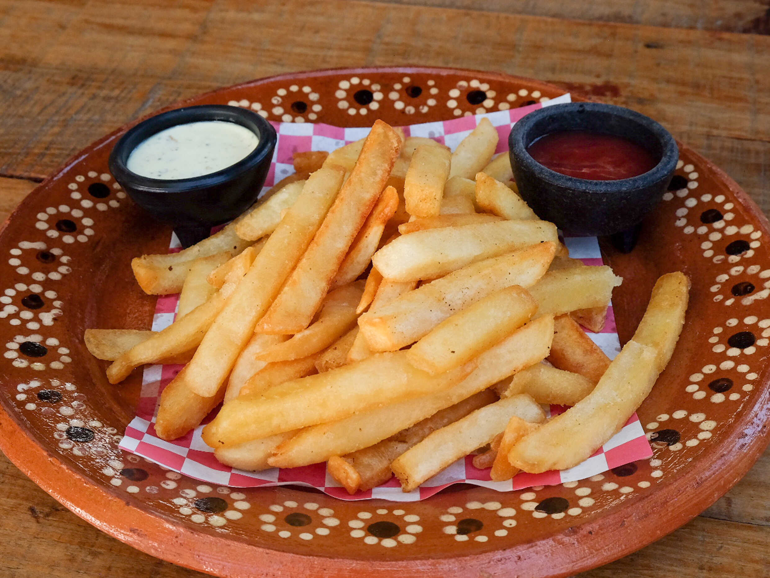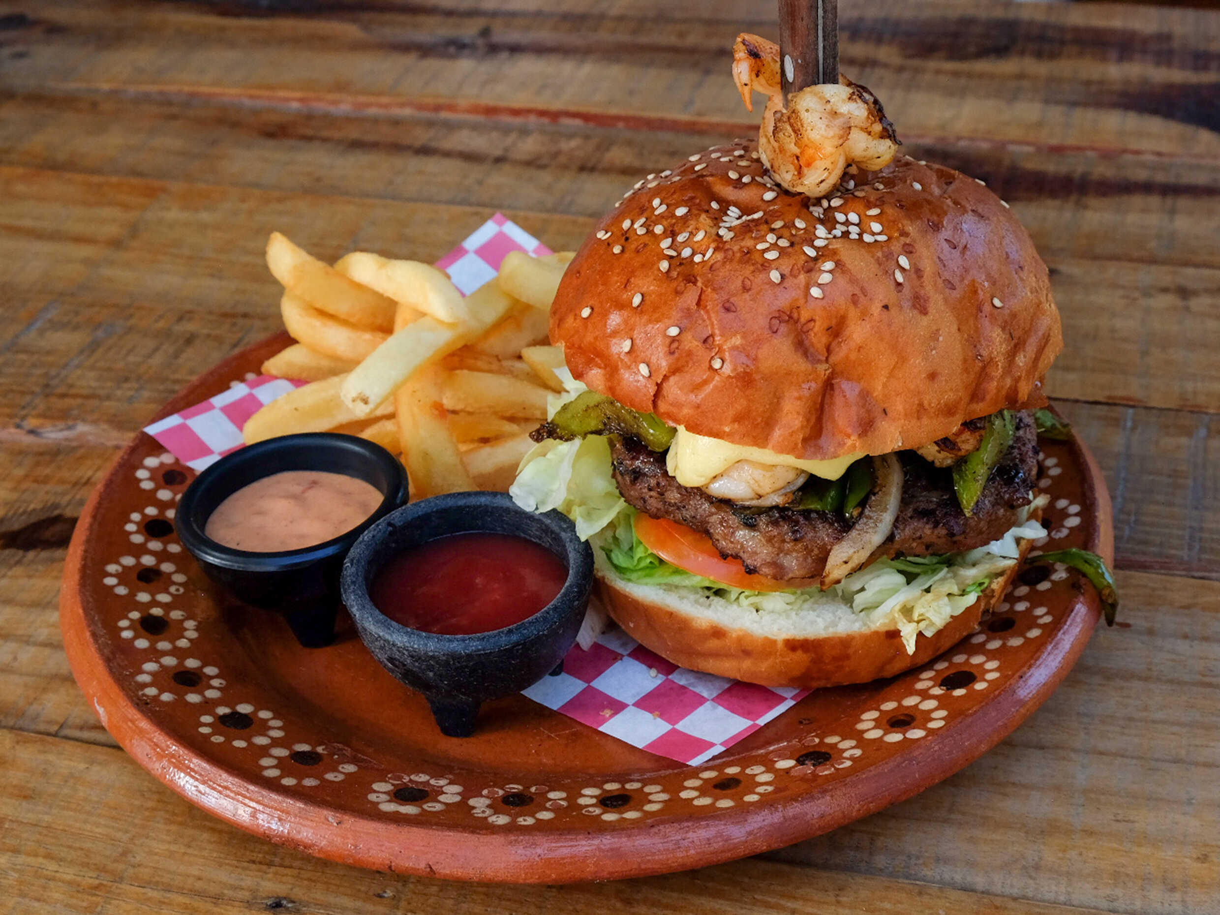 Carne de res, camarón salteado, cebolla asada, morrón, queso gouda, jitomate, cebolla, jalapeño, lechugas y papas francesas.