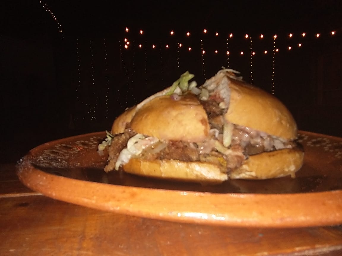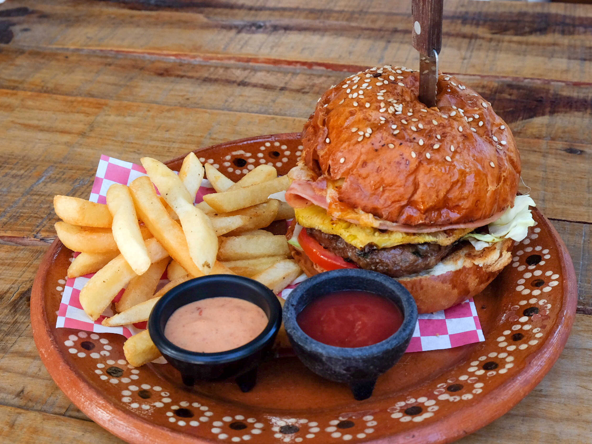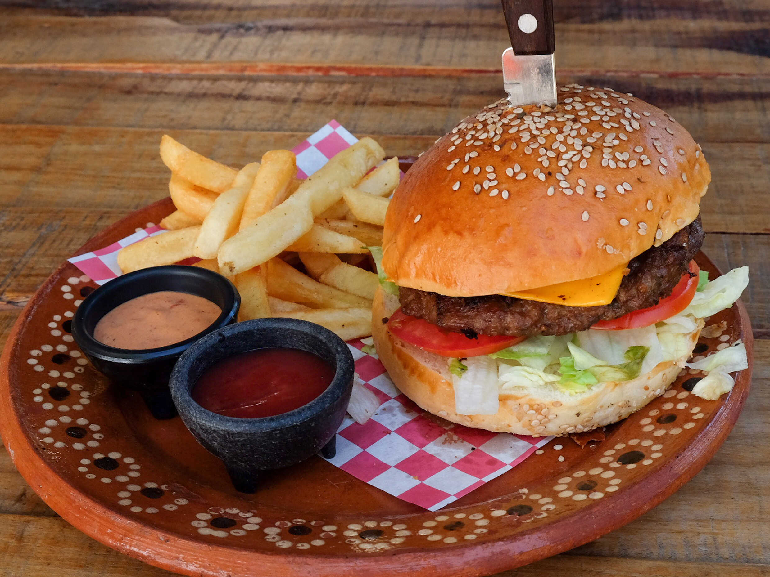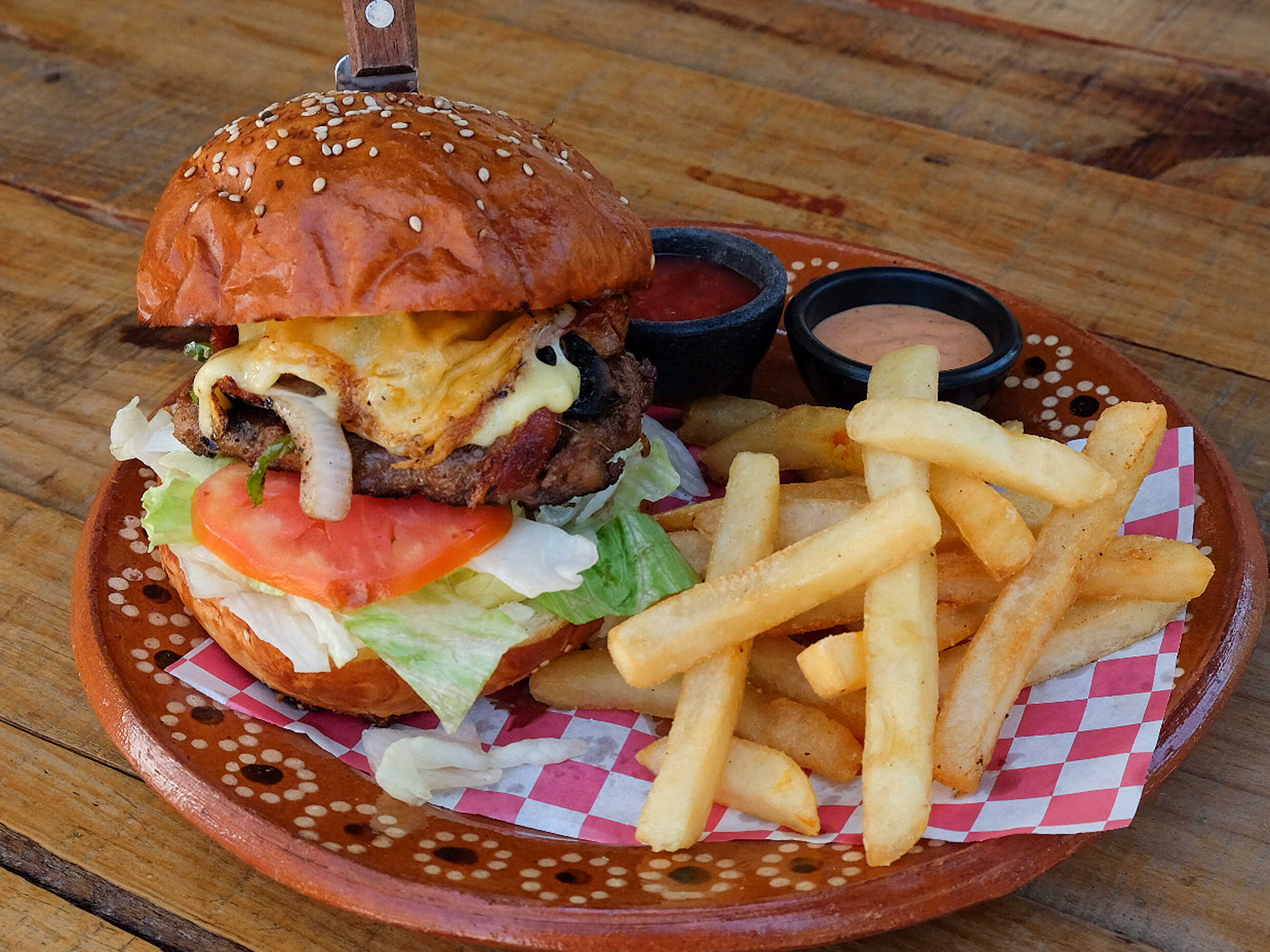 Carne de res, aros de cebolla, aguacate, queso gouda, BBQ, jitomate, cebolla, jalapeño, lechuga y papas a la francesa.