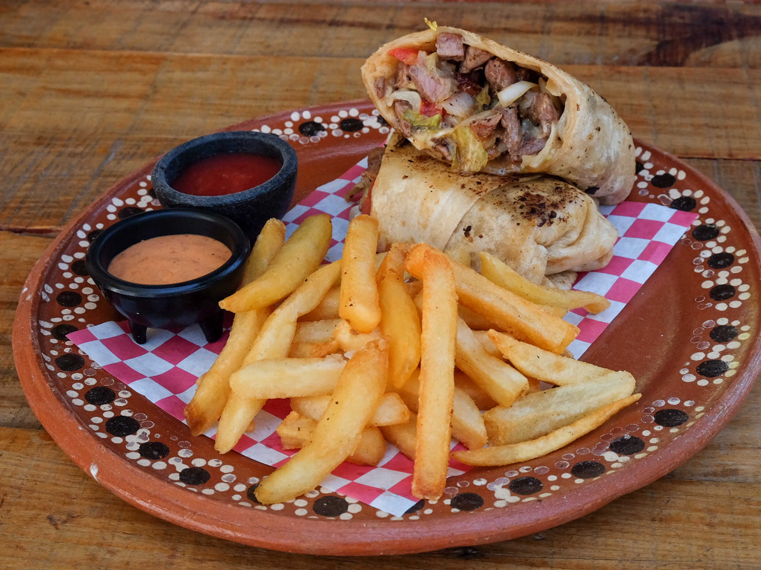 Tortilla de harina jumbo, arrachera marinada, frijoles fritos, queso gouda, lechuga, jitomate, cebolla, jalapeño y aderezo chipotle. Incluye papas francesas.