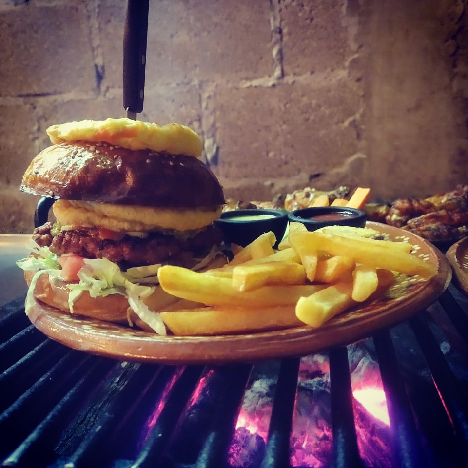 Carne de la casa, tocino, cebolla asada, champiñón asado, queso gouda, jitomate, cebolla, jalapeño, lechuga y papas francesas.