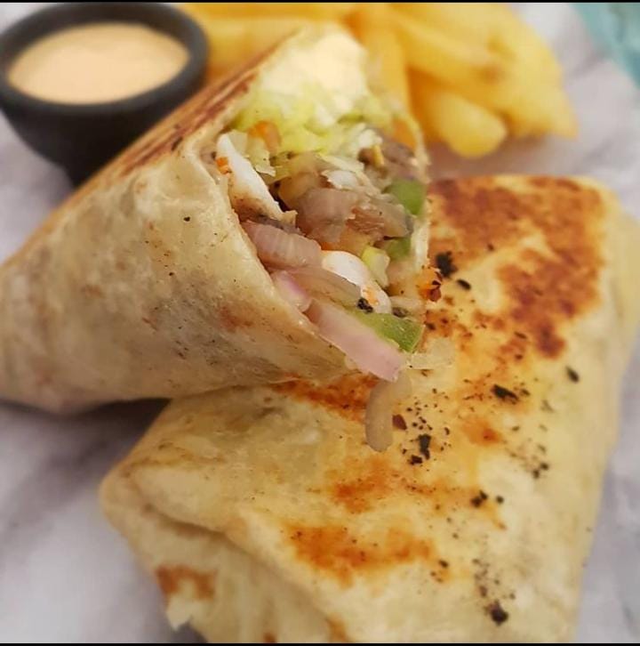 Tortilla de harina, camarón, morrón, cebolla, queso gouda, jitomate, cebolla, jalapeño y una porción de papas.
