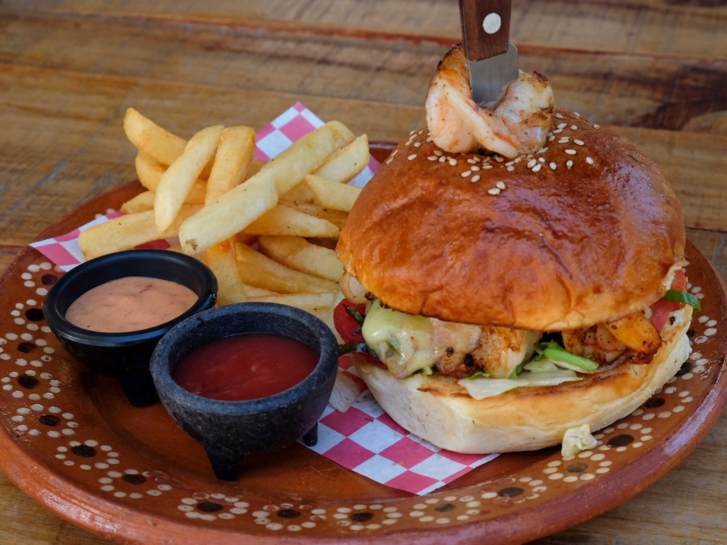 Camarón salteado, cebolla asada, morron, queso gouda, jitomate, cebolla, jalapeño, lechuga y papas.
