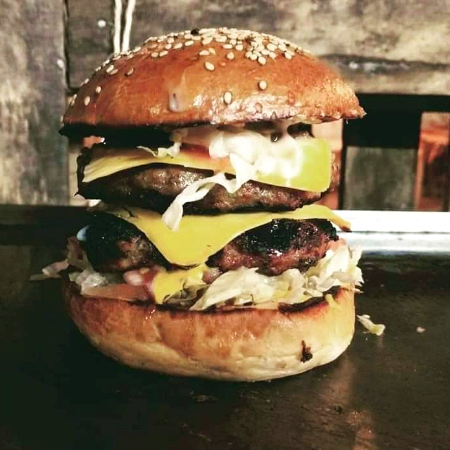 doble carne de res, queso gouda, lechuga, jitomate, cebolla, chile jalapeño, mayonesa, catsup, mostaza