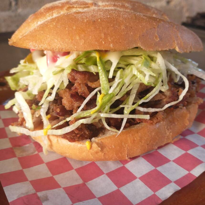 Pollo empanizado, queso gouda, lechuga, cebolla, jitomate, chile jalapeño,catsup y mayonesa