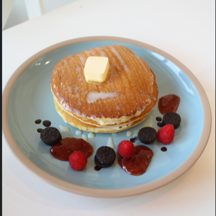 3 piezas acompañados con fruta de temporada, mantequilla y dos opciones de topping (nutella, miel de abeja, miel de maple, oreos, chocolate hershey’s, leche condensada, mermelada, crema batida).
