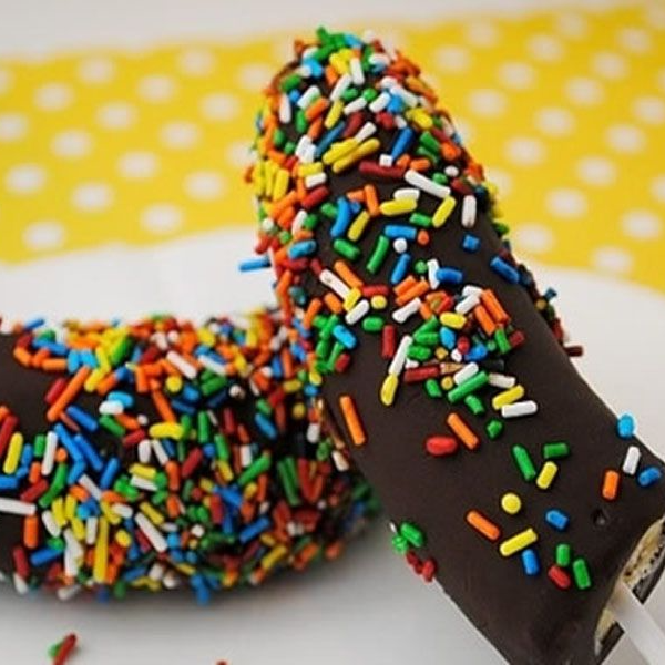 Un plátano completo helado cubierto de chocolate amargo y bañado con chispas de colores. Cold banana covered in dark chocolate and covered with colorful sprinkles.