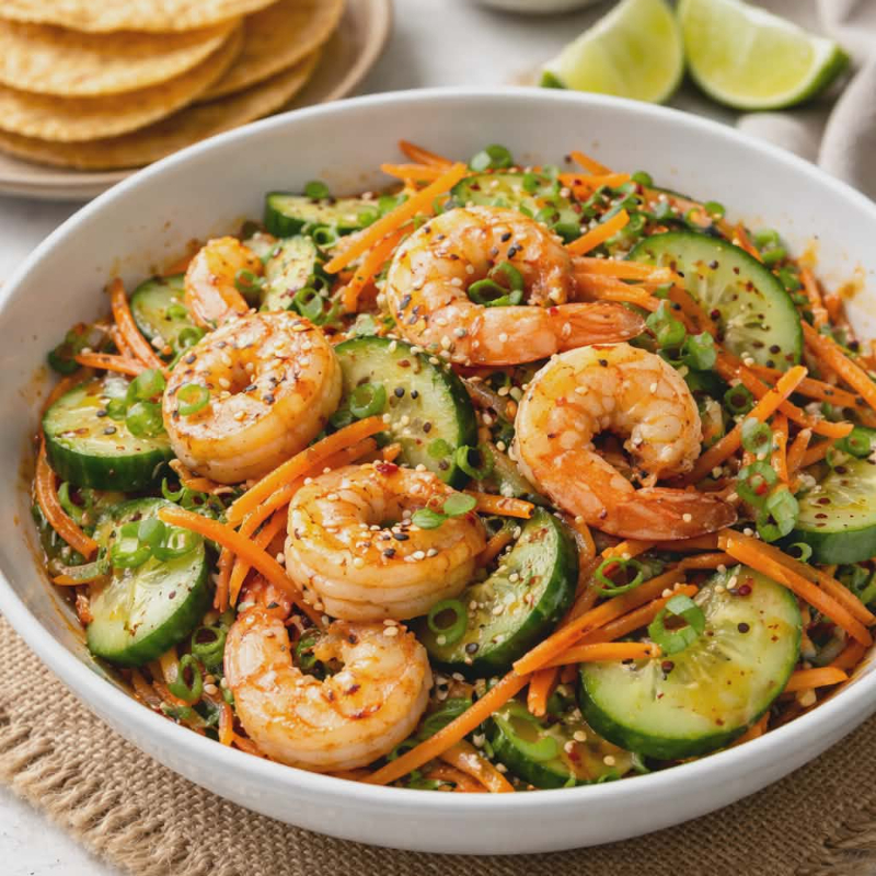 Pepino en media luna, zanahoria rallada, camaron cocido, salsa de soya, vinagre de arroz y ajonjoli
