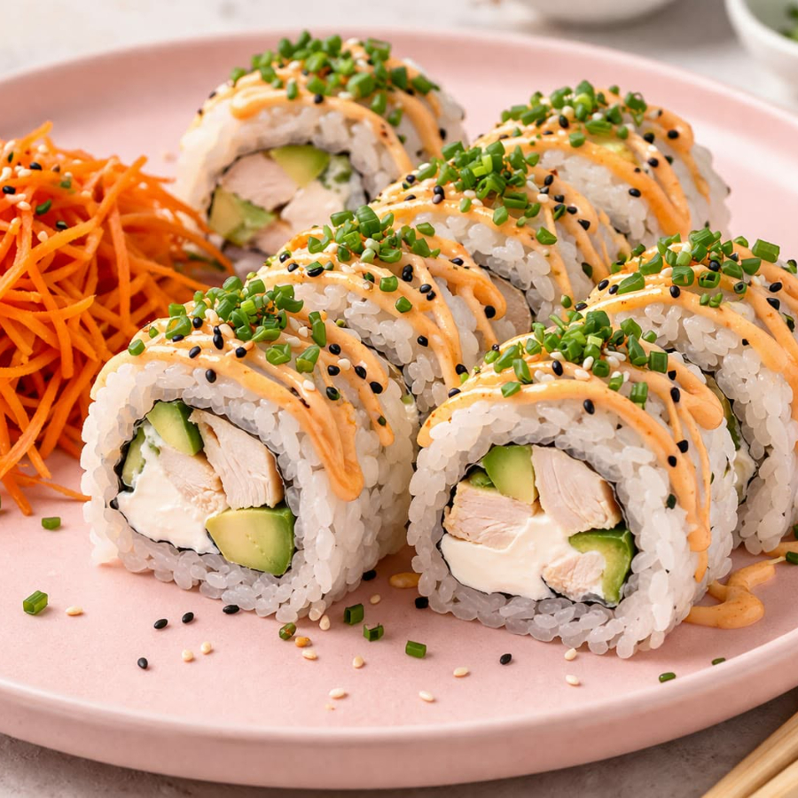 Afuera: Arroz, Adentro: alga, pollo, queso crema, aguacate, Encima: Spicy mayo, cebollin y ajonjoli