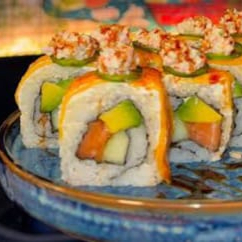 Surimi, queso crema, pepino, empanizado decorado con aguacate