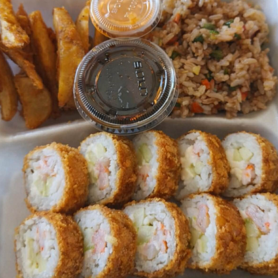 1 Rollo empanizado estilo california ( camaron, pepino, queso crema), 1 porcion de yakimeshi natural y papas gajo crujientes