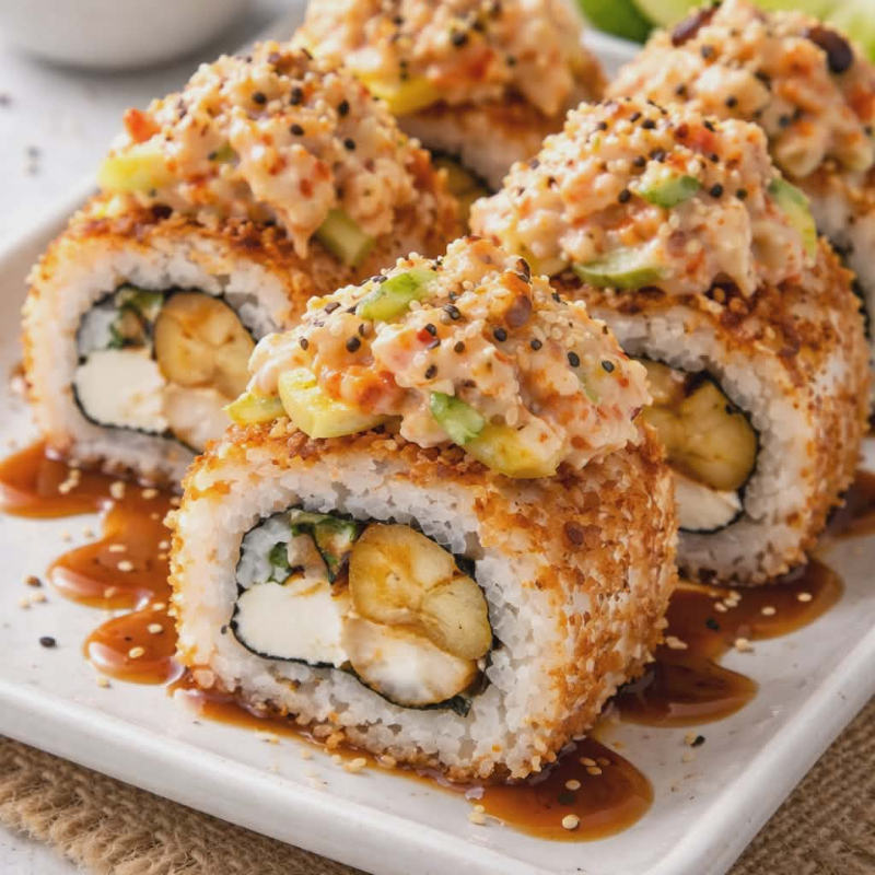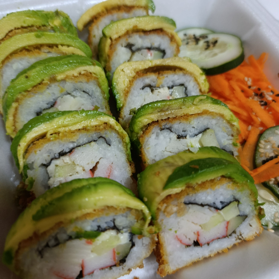 Afuera: Arroz empanizado, Adentro: surimi, queso crema, pepino, Encima: aguacate y ajonjoli