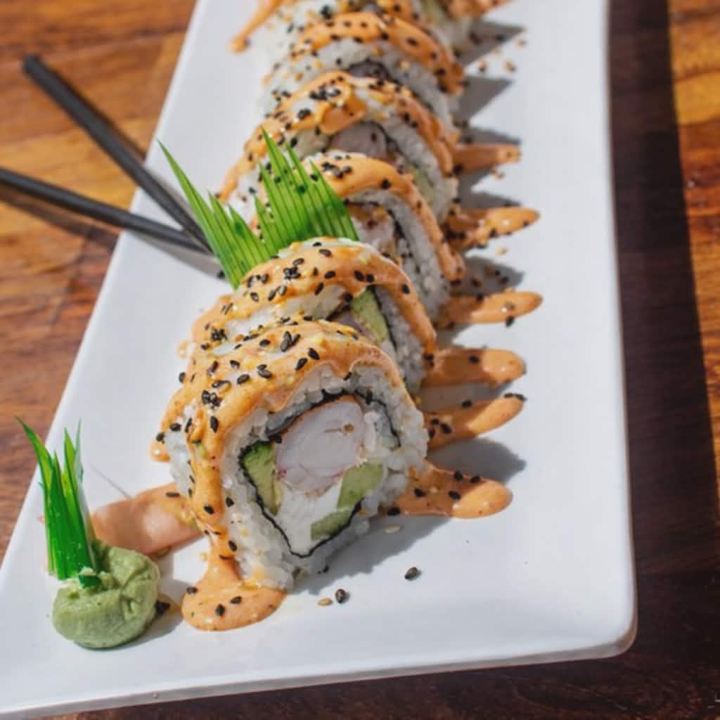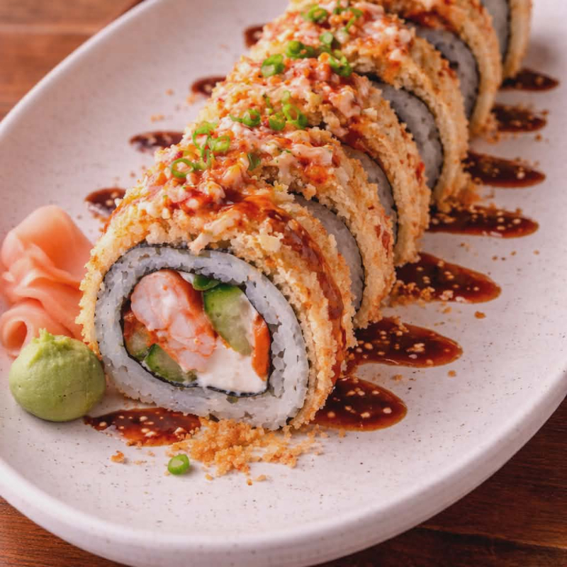 Empanizadas, camaron, queso crema, aguacate, zanahoria, pepino, mayonesa chipotle decorada con tampico y salsa anguila