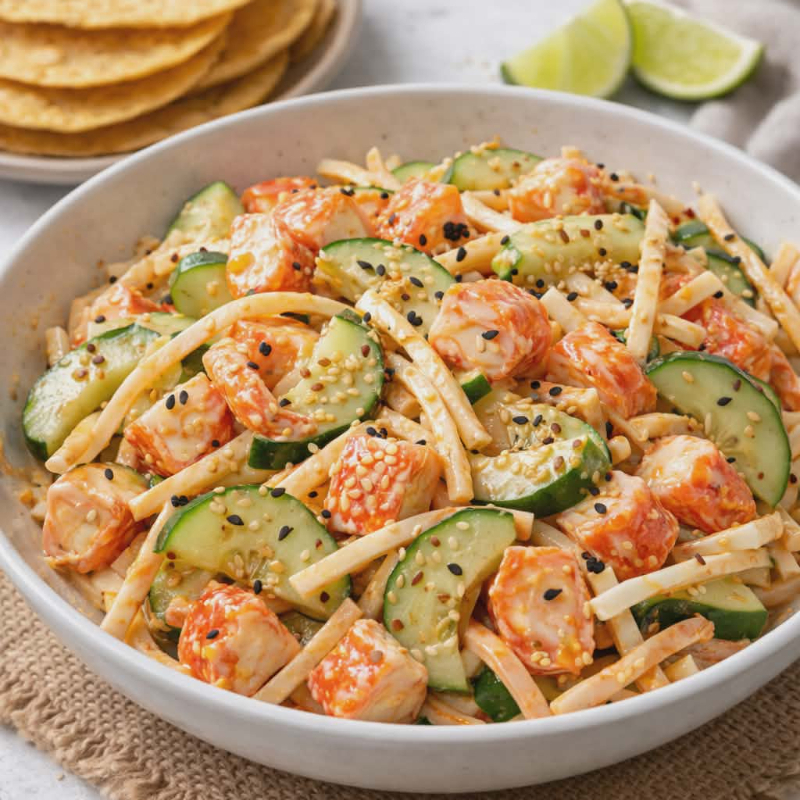 Pepino en tiritas, jicama, cangrejo surimi, mayonesa, salsa de soya y ajonjoji