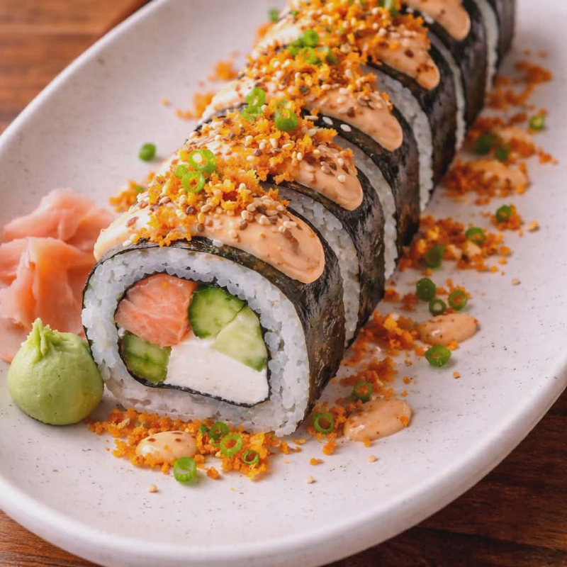 Afuera: Alga, Adentro: Arroz, salmon, queso crema y pepino, Encima: Spicy Mayo y crumble de zanahoria