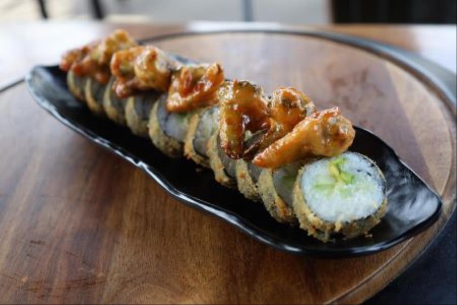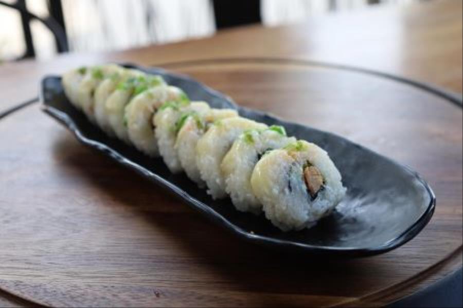 ALGA POR FUERA, POR DENTRO QUESO CREMA, PEPINO, AGUACATE EMPANIZADO CON ALMENDRA Y FRITO CON UN TOPPING DE CAMARONES CAPEDOS EN SALSA DE TAMARINDO Y CHIPOTLE