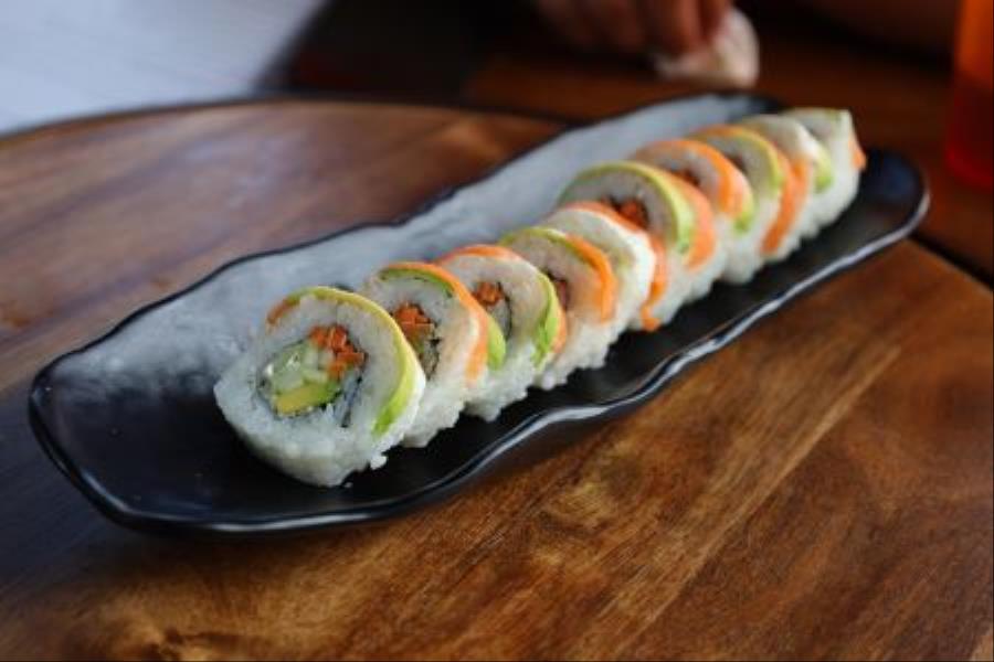 QUESO CREMA, CAMARON, PEPINO,ZANAHORIA, AGUACATE, POR FUERA ADEREZO DE MASAGO, CEBOLLIN Y KANIKAMA