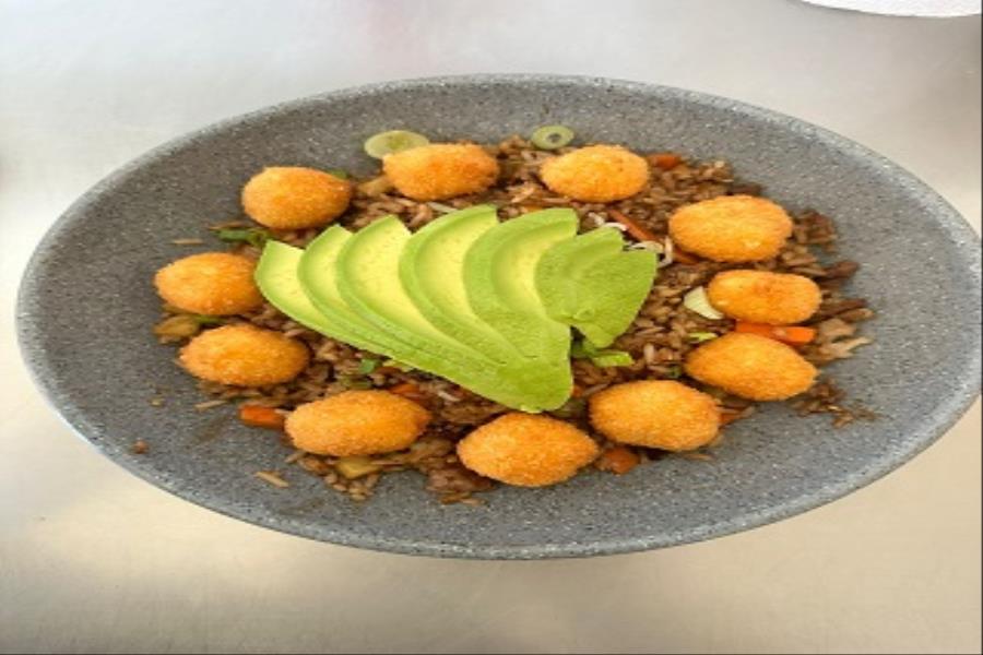 ARROZ FRITO CON VERDURAS CAMARON Y RES CORONADO CON BOLITAS DE QUESO EMPANIZADO Y AGUACATE Y CEBOLLIN
