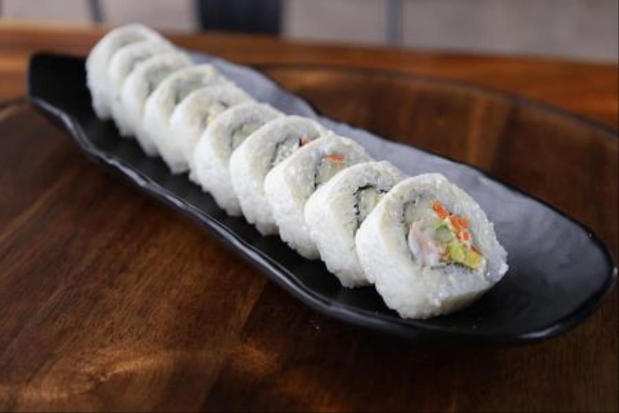 POR DENTRO CAMARON, QUESO CREMA, AGUACATE, PEPINO Y ZANAHORIA POR FUERA CUBIERTO DE QUESO CREMA