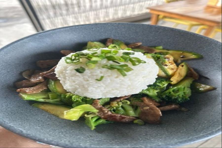COMBINACION DE CARNE, BROCOLI, CALABAZA Y SALSA DE OSTION CON UNA PORCION DE ARROZ BLANCO
