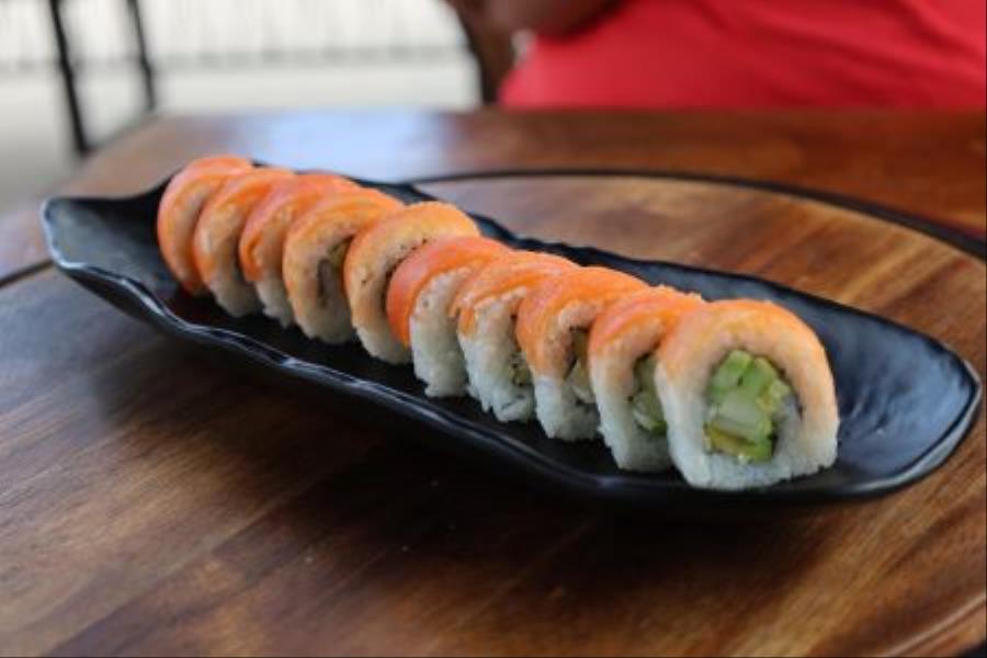 POR DENTRO QUESO CREMA, PEPINO, AGUACATE, POR FFUERA ANGUILA, CORONADA CON ATUN, SALMON Y CALLO PREPARADO CON UN ADEREZO DE TAMARINDO Y CHIPOTLE