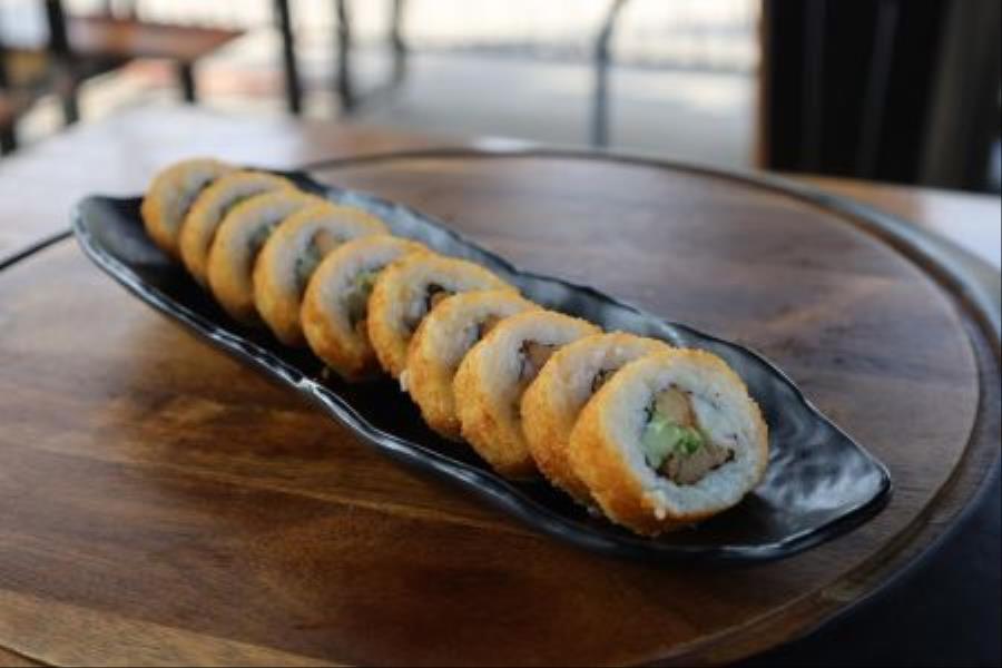 Sushi Mar y Tierra de 10 bocados con camarón, res, queso crema, aguacate y pepino por dentro; empanizado con panko y frito.